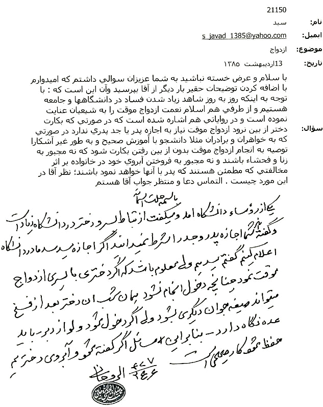 هشت – با اذن يا دستور مولي ازدواج غلام با زن حره و ازدواج كنيز با مرد حر مجاز است. در زماني كه كنيز به صلاحديد مولي در زوجيت غير است، هرگونه استمتاع جنسي مولي از وي ممنوع است. (منهاج 2 / 277)